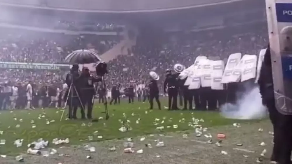 Источник пишет, что во время матча "разгневанные болельщики" швыряли на поле посторонние предметы: бутылки с водой, петарды и ножи.