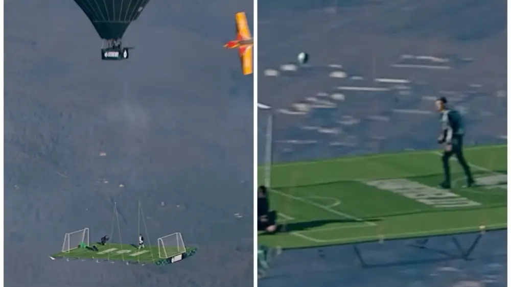 На видео, размещённом в Instagram, можно заметить, что "футбольное поле" с настоящими воротами и разметкой подвешено на специальные крепления к воздушному шару.