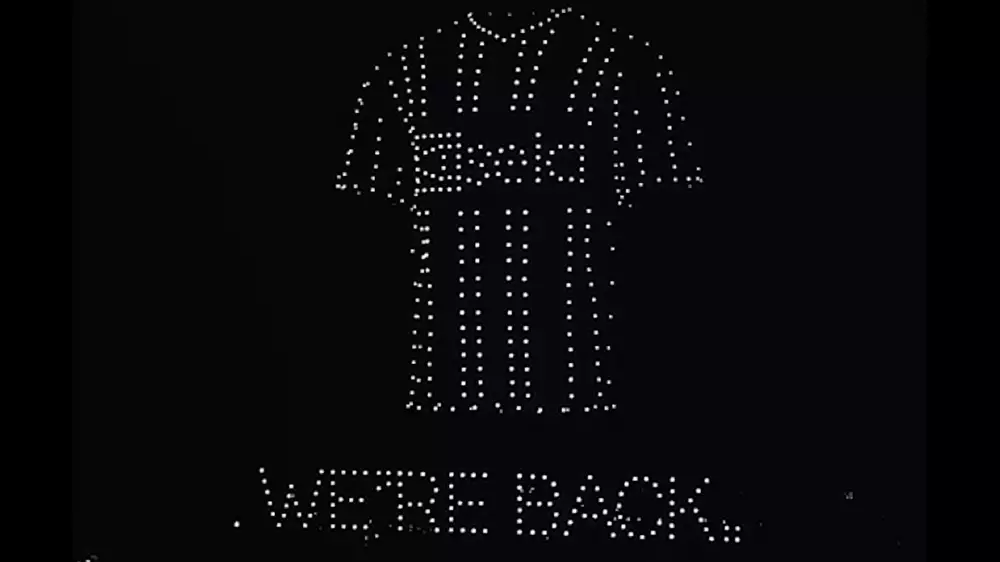 В рамках шоу из световых беспилотников формируется футболка с эмблемой клуба, надпись "мы вернулись" и другие символы, связанные с командой.