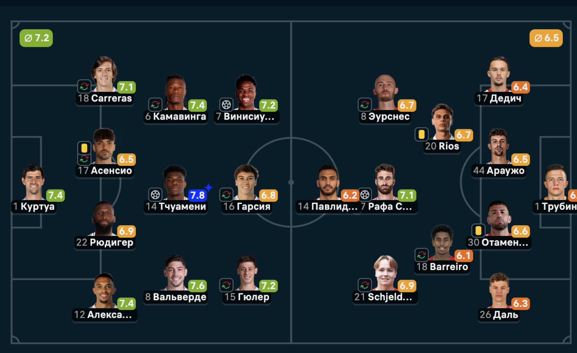 "Реал": Куртуа (В), Александр-Арнольд, Рюдигер, Асенсио, Каррерас, Тчуамени, Вальверде, Камавинга, Гюлер, Винисиус, Гарсия.