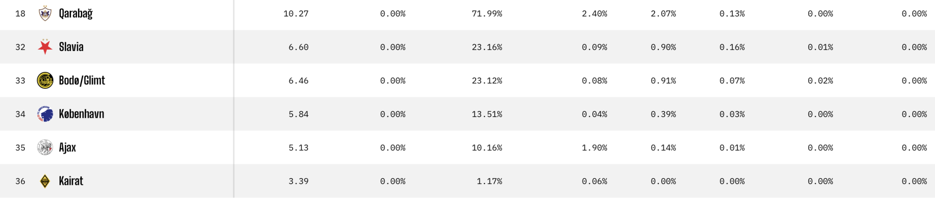 Суперкомпьютер также не видит перспектив на победу у азербайджанского "Карабаха", чешской "Славии", норвежского "Будё-Глимт", датского "Копенгагена" и нидерландского "Аякса".