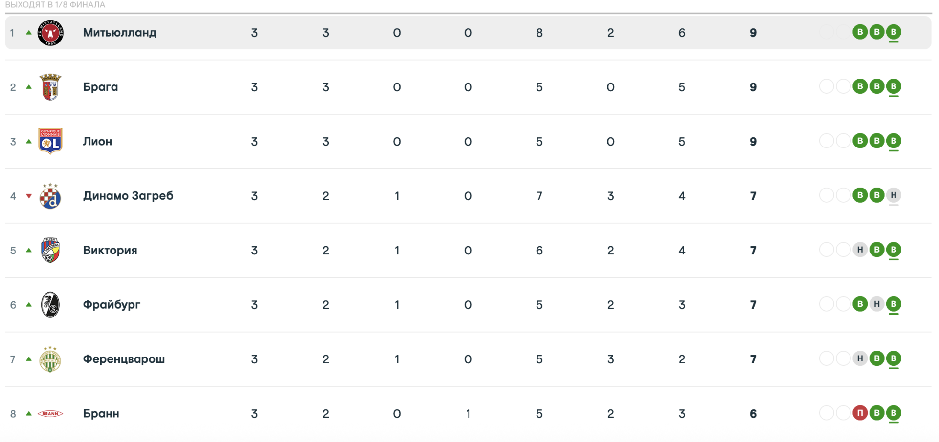 Неожиданный лидер общего этапа после двух туров - датский "Митьюлланд" продолжает победное шествие, также к датчанам присоединились португальская "Брага" и французский "Лион".