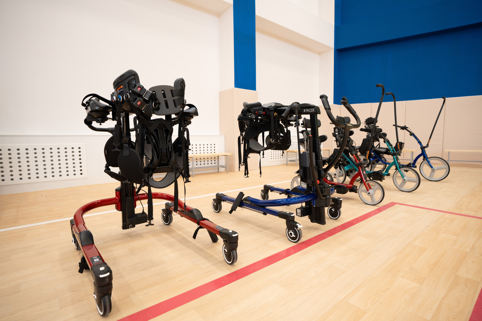 Отдельное внимание уделено оснащению. Центр оборудован редким и специализированным реабилитационным оборудованием, включая цифровую лабораторию для тренировки и восстановления, тренажёры для реабилитации рук, мобильные подвесные системы с беговой дорожкой, системы оценки ходьбы, столы для кинезотерапии и роботизированные вертикализаторы. Оборудование предназначено для людей с нарушениями опорно-двигательного аппарата, зрения и слуха, пользователей кресел-колясок, а также параспортсменов.