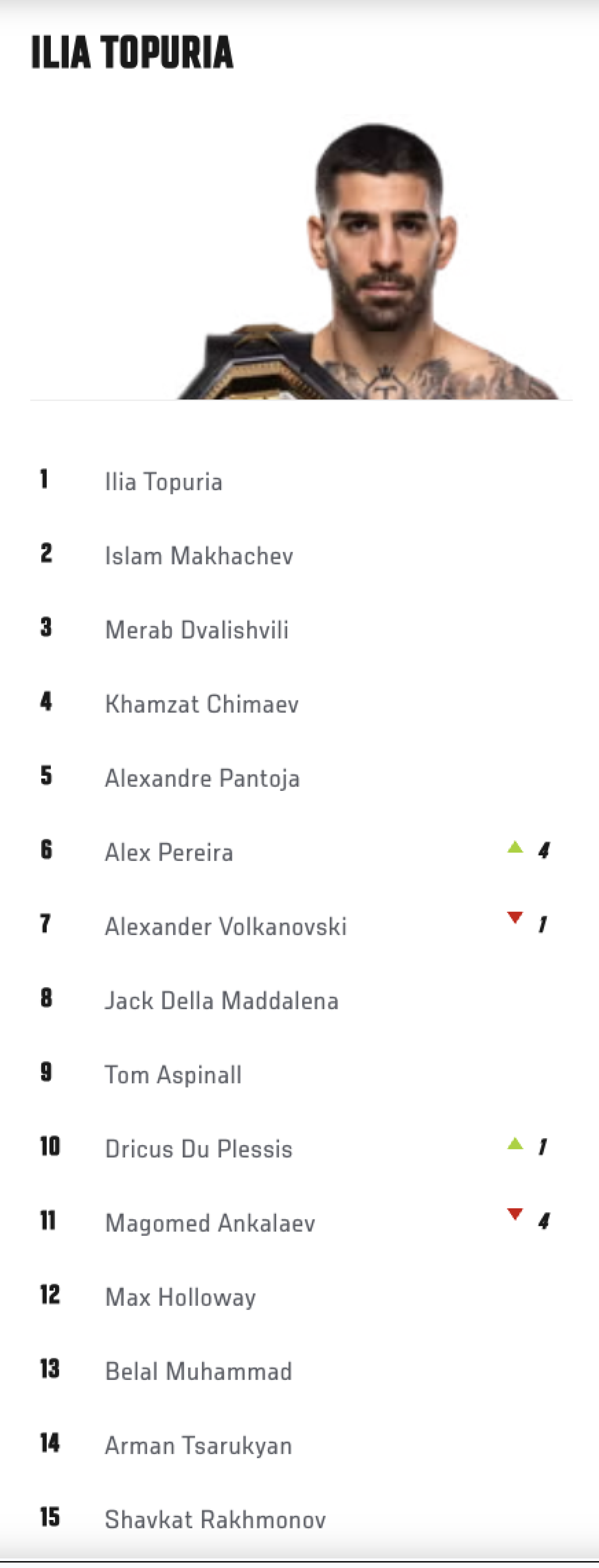 Так, после победы в очной схватке бразилец Алекс Перейра обошел россиянина Магомеда Анкалаева и поднялся на шестую строчку рейтинга.