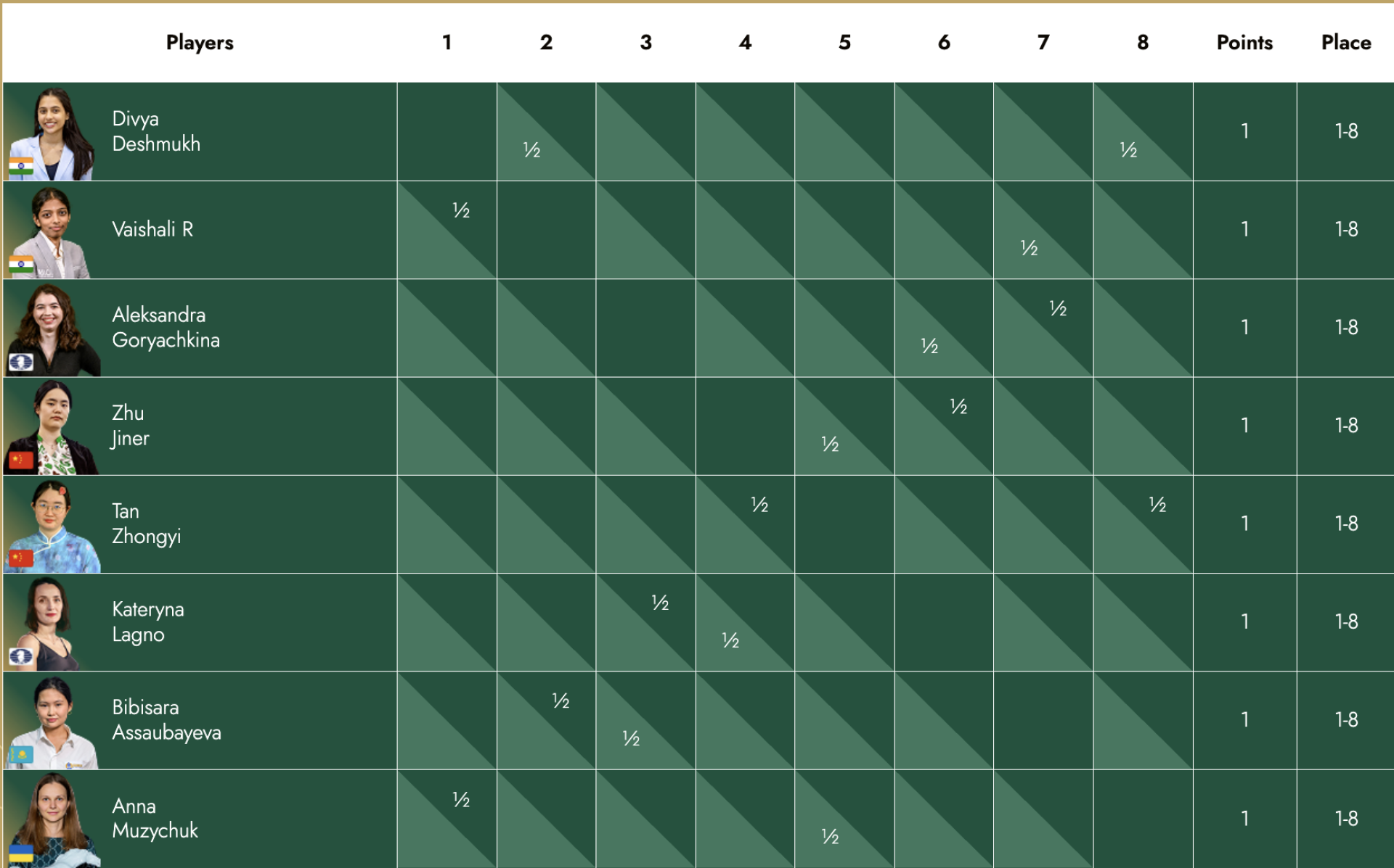 После первых двух раундов на турнире сложилась уникальная ситуация - все матчи завершились ничьей. Таким образом, у каждой из восьми шахматисток по 1 очку и место в таблице, которое одновременно определяется и как первое, и как восьмое.