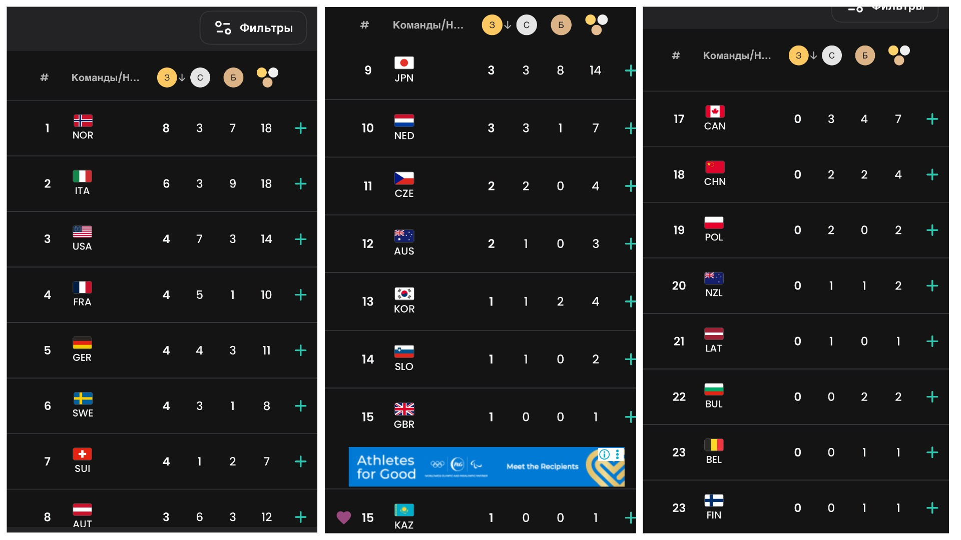 Отметим, что в медальном зачёте приоритет отдаётся золотым медалям, поэтому, несмотря на то, что награда Шайдорова пока единственная для Казахстана на Играх 2026 года, в таблице команда поднялась выше тех, у кого в Италии уже четыре и даже семь наград.