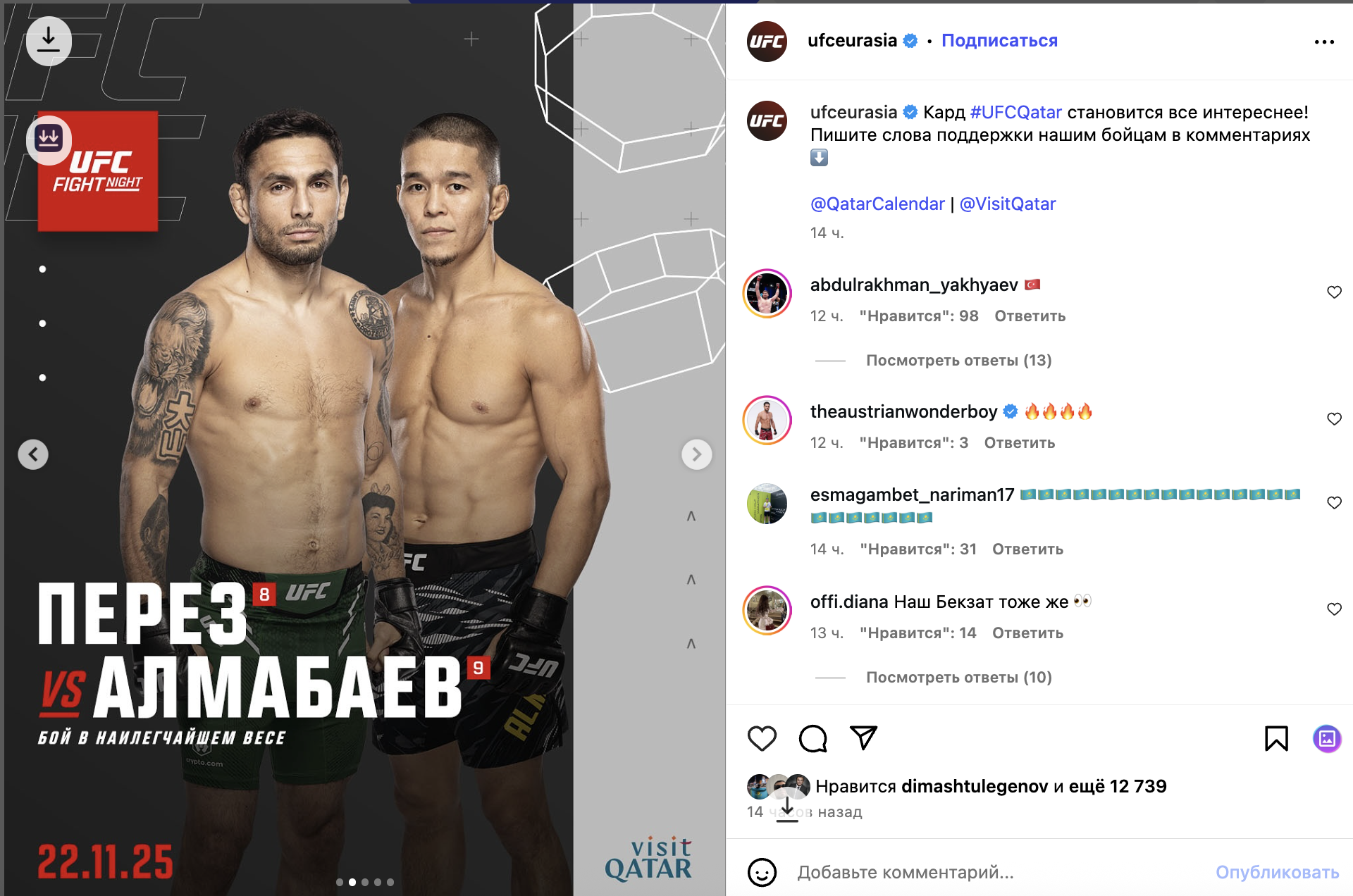 Официальный аккаунт UFC Eurasia объявил, что следующий бой Алмабаева пройдет в Дохе 22 ноября 2025 года. Соперником будет опытный американский боец Алекс Перез (25-9).
