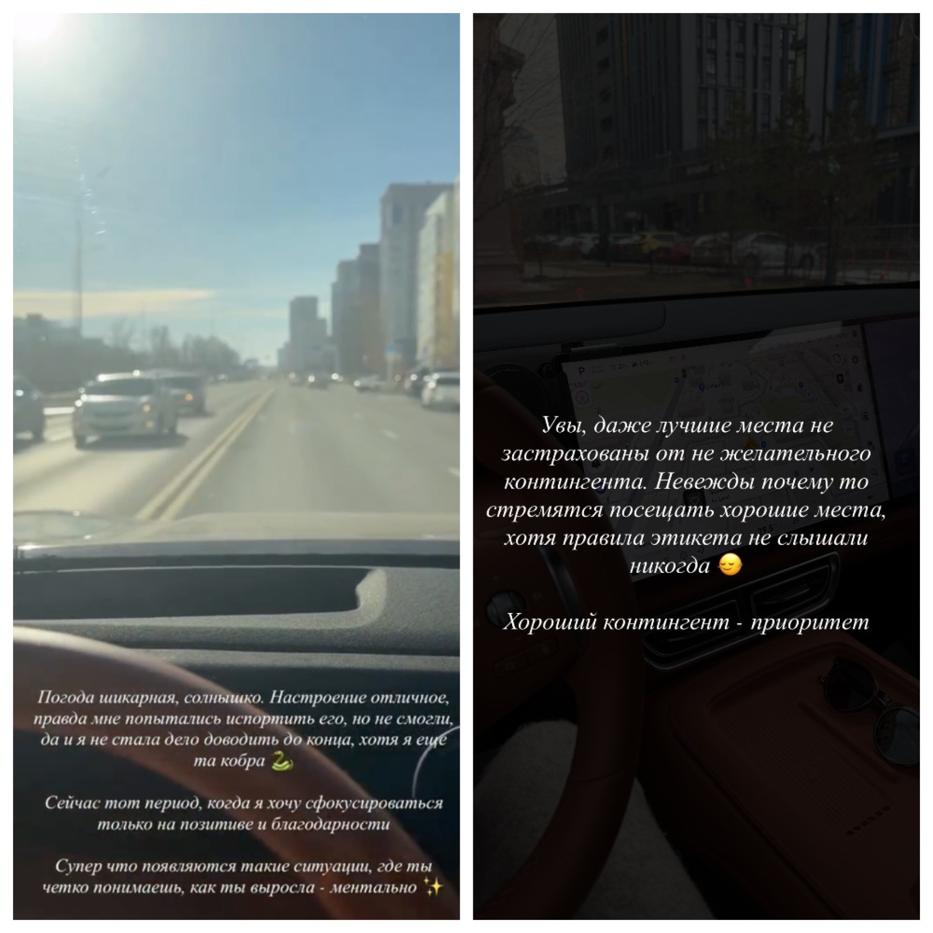 В своих социальных сетях Сабина Алтынбекова поделилась со своей аудиторией историей о том, как кто-то попытался испортить ей настроение, но она удержала себя в руках, чтобы не усугублять ситуацию.