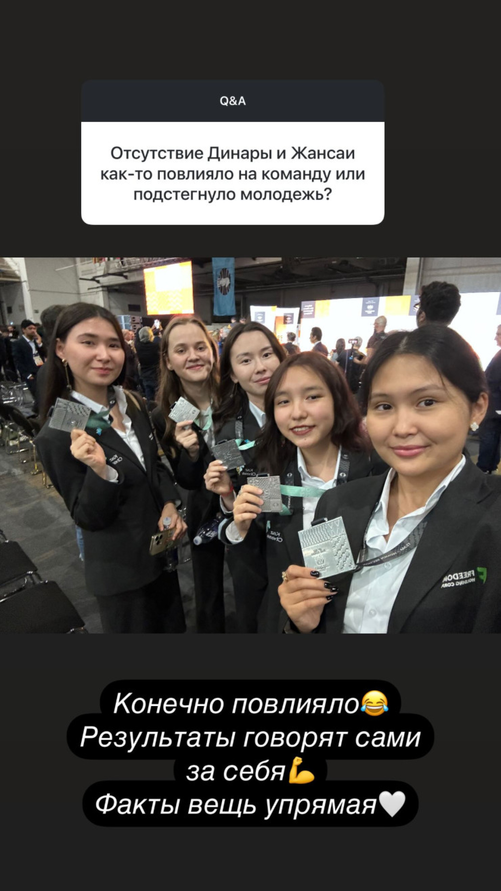 Тогда Бибисара Асаубаева в своих социальных сетях на вопрос о том, повлияло ли отсутствие Абдумалик на результат команды, дала понять, что, по ее мнению, результаты стали лучше.