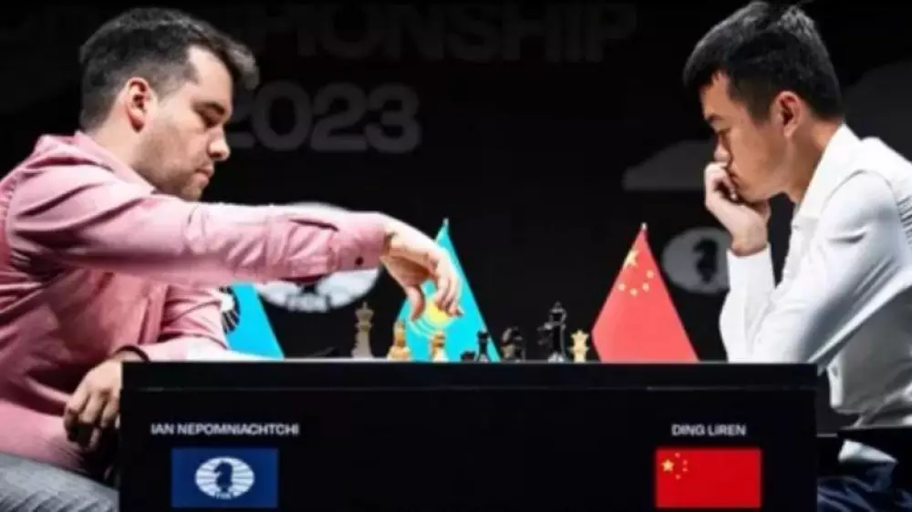 Министр культуры и спорта Асхат Оралов сделал символический ход в первой партии матча за звание чемпиона мира, после чего российский гроссмейстер Ян Непомнящий и лучший игрок Китая Дин Лижэнь начали противостояние.