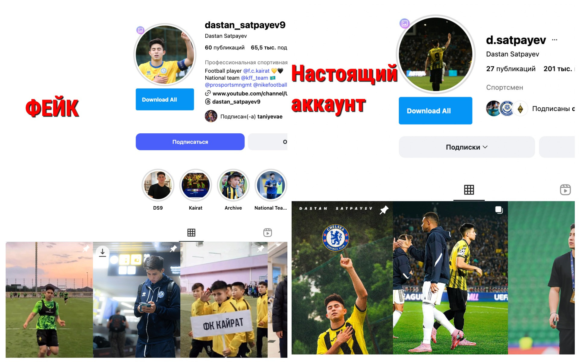 Первое отличие - количество подписчиков. Несмотря на то, что у фейковой странички уже много поклонников, у настоящей еще больше - 200 тысяч человек. Понять, что именно эта страничка реальная, можно также по совместным публикациям: клуб и федерация футбола делает посты вместе с настоящим Дастаном Сатпаевым.