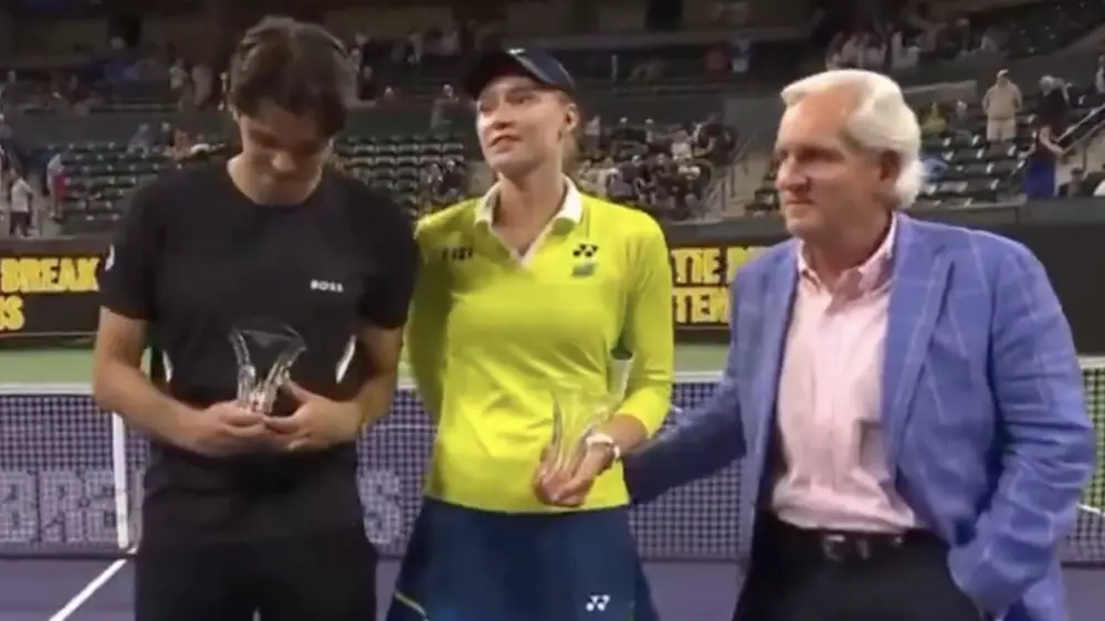 По всей видимости, компания — главный спонсор турнира, в котором Елена Рыбакина вместе с американцем Тейлором Фрицем выиграла 200 тысяч долларов.