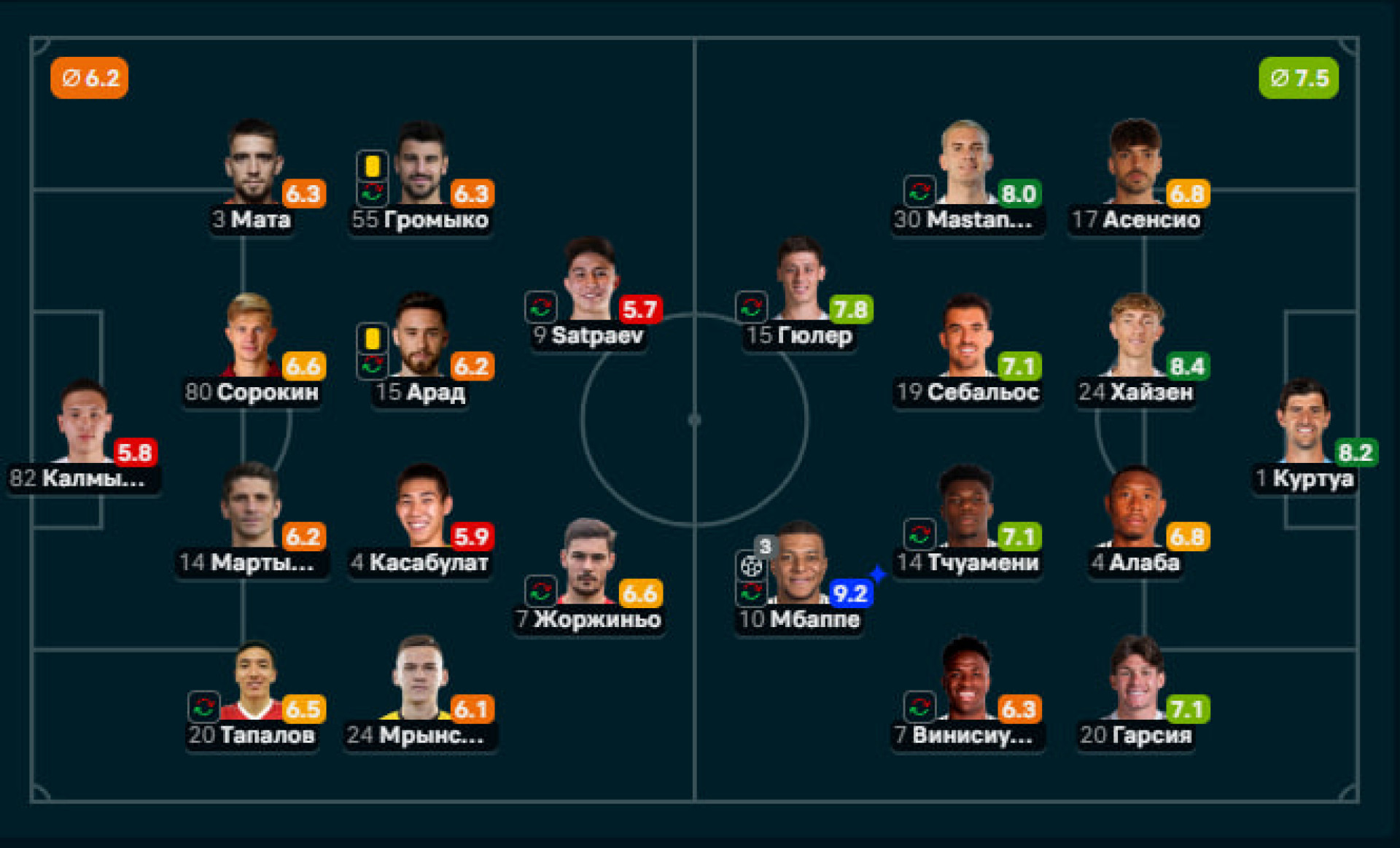 18-летний вингер отметился 3 ударами (1 в створ), 10 передачами (7 точных), 3 касаниями в штрафной соперника, 100 процентов успешных выигранных верховых единоборств (1/1) и успешных отборов (1/1). Футболист получил оценку 5.7, что является самым худшим рейтингом в составе "Кайрата".