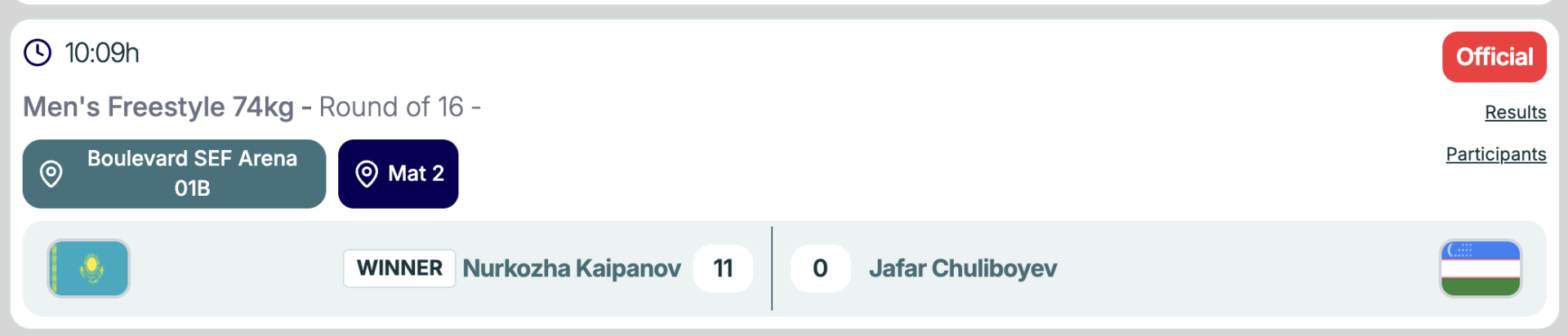 Помимо Кайпанова, в 1/4 финала Игр исламской солидарности вышел и другой чемпион мира по борьбе из Казахстана – Ризабек Айтмухан. Он победил Мухамеда Мустафу Али Салахедлина из Египта со счетом 10:0.