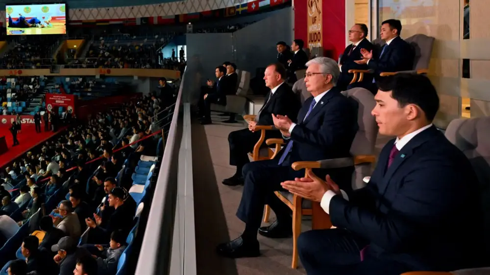 На трибуне вместе с Главой государства присутствовали президент Международной федерации по дзюдо (IJF) Мариус Визер и олимпийский чемпион Елдос Сметов.