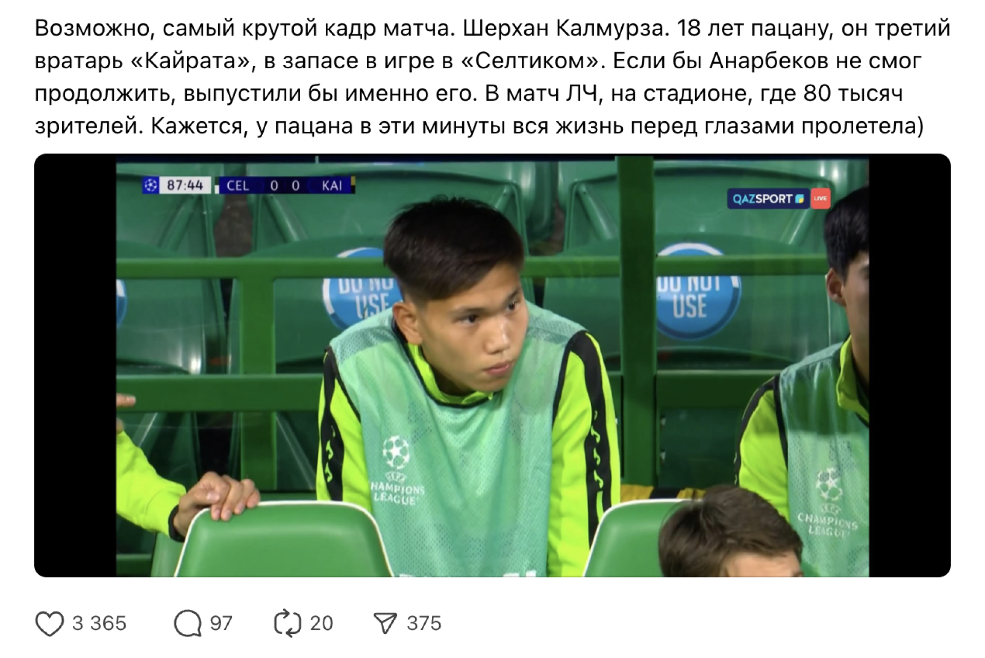 Сначала вирусным стало выражение лица Шерхана в момент, когда его партнер по команде Темирлан Анарбеков получил травму во время игры с "Селтиком" в квалификации Лиги чемпионов.