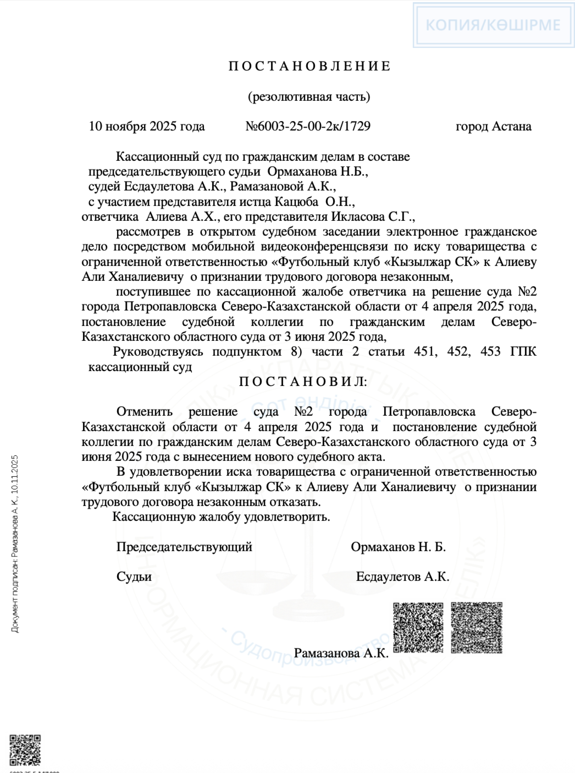 Кассационный суд признал правоту одного из тренеров сборной Казахстана по футболу Али Алиева в споре с футбольным клубом "Кызылжар" из Петропавловска, передаёт Tengri Sport.