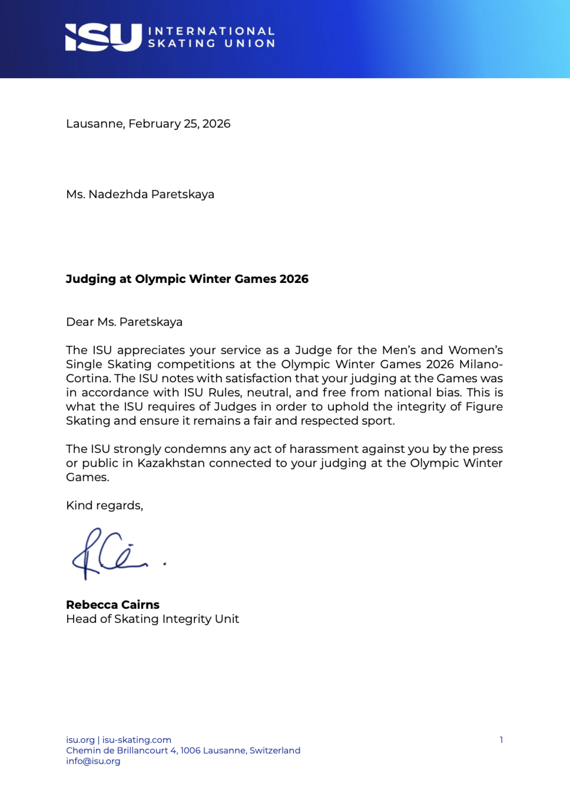 ISU решительно осуждает любые акты преследования в отношении вас со стороны прессы или общественности в Казахстане, связанные с вашим судейством на зимних Олимпийских играх", - говорится в письме, опубликованном на сайте КФФК.