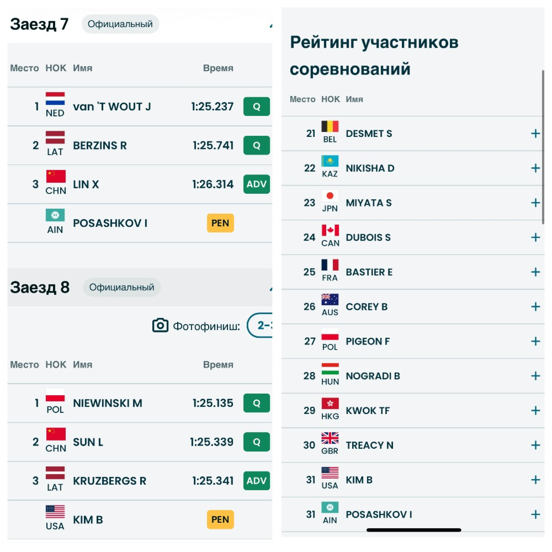 Когда до завершения квалификации оставалось два забега, казахстанец входил в топ-4 среди третьих мест и мог бы пробиться в четвертьфинал. Однако из седьмого забега арбитры добрали китайца Линя, который был медленнее Дениса - 1:26.314.