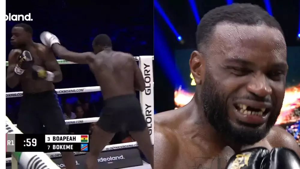 Ulric Bokeme just got his front row of teeth knocked out against Michael Boapeah. He told his corner he couldn't continue because some went down his throat. #COLLISION5 pic.twitter.com/Kqc4JGY6Ck