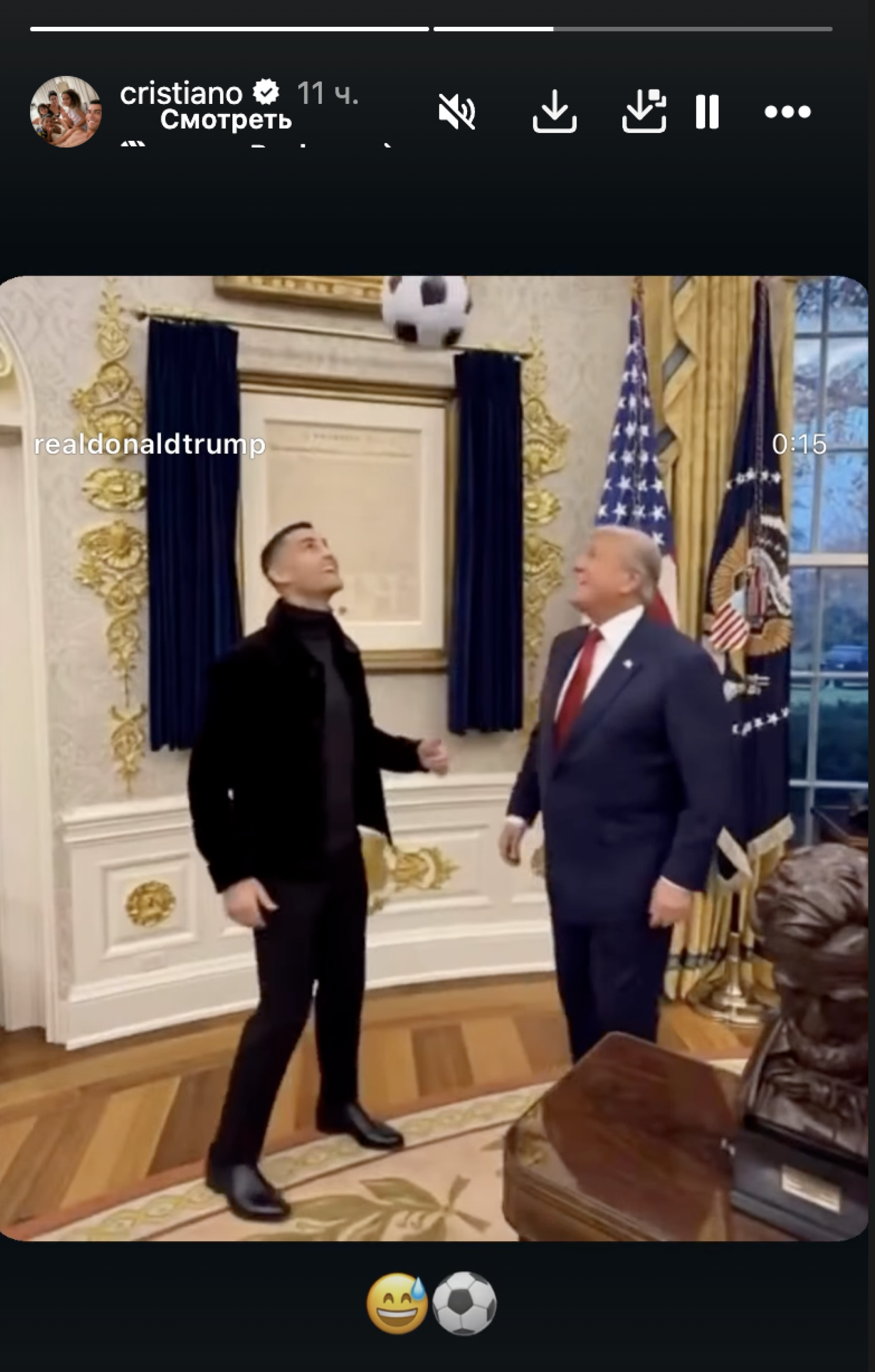 В социальных сетях президента США Дональда Трампа опубликовали видео, на котором лидер Соединенных Штатов в овальном кабинете Белого дома играет в футбол со звездой сборной Португалии, нападающим саудовского "Аль-Насра" Криштиану Роналду.