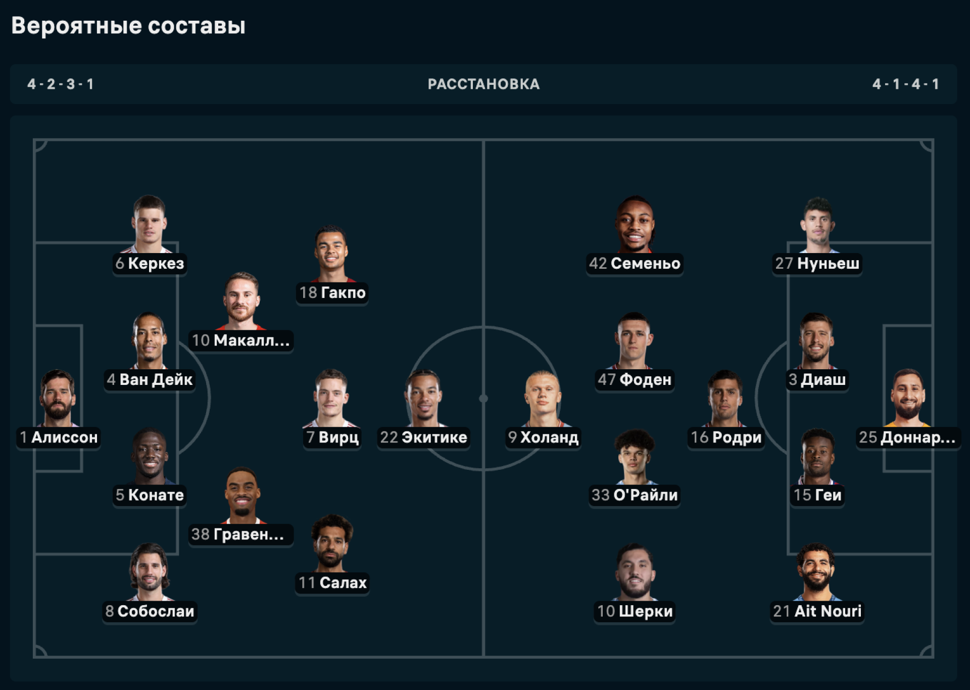 "Ливерпуль": Алиссон (В), Собослаи, Конате, Ван Дейк, Керкез, Гравенберх, Макаллистер, Салах, Вирц, Гакпо, Экитике.