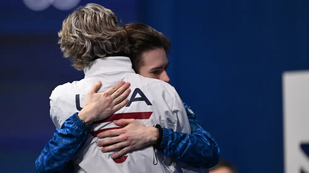После того как командный олимпийский чемпион остался без медалей в личном зачете среди мужчин, Малинин немедленно отбросил все личные разочарования, чтобы обнять и поздравить золотого призера Михаила Шайдорова.