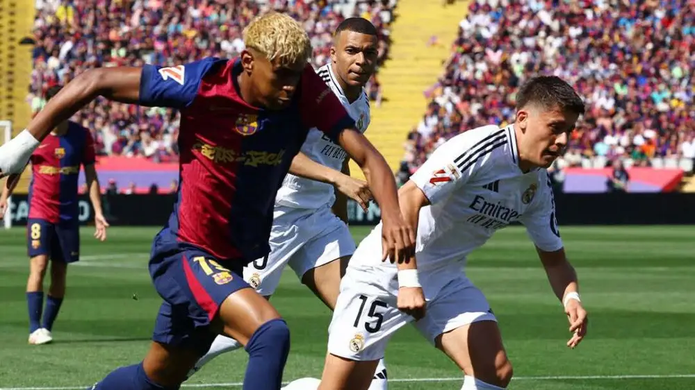 В середине первого тайма защитник сине-гранатовых Эрик Гарсия сократил их отставание в счете. На 32-й минуте счет в игре сравнял 17-летний вингер каталонцев Ламин Ямаль. На 34-й минуте нападающий Рафинья вывел "Барселону" вперед. В конце первого тайма Рафинья забил свой второй гол в матче. На 70-й минуте Мбаппе забил третий мяч "Реала" в матче, оформив хет-трик.