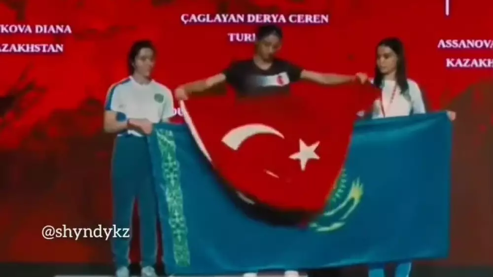 В соцсетях активно распространяется видео с чемпионата мира по армрестлингу в Анталье. На кадрах можно заметить, как две казахстанки, занявшие второе и третье места, развернули национальный флаг Казахстана на пьедестале. Затем на первую ступеньку поднялась спортсменка из Турции, которая также развернула флаг своей страны.