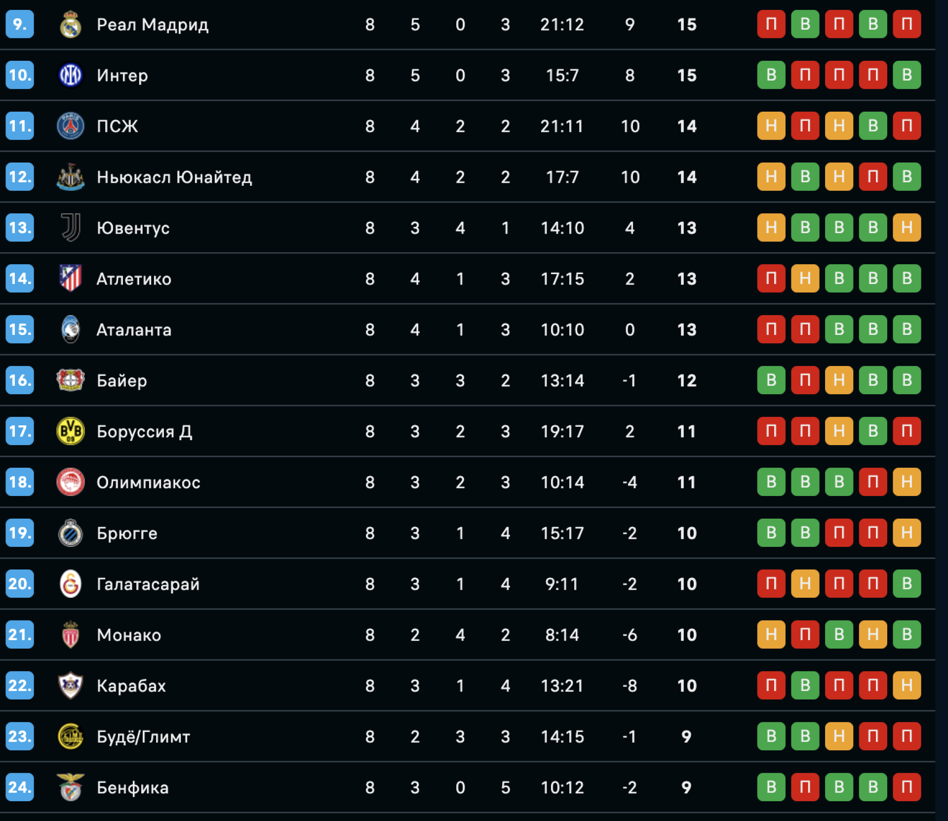 "Реал Мадрид" (Испания), "Интер" (Италия), ПСЖ (Франция), "Ньюкасл" (Англия), "Ювентус" (Италия), "Атлетико" (Испания), "Аталанта" (Италия), "Байер" (Германия), "Боруссия Д" (Германия), "Олимпиакос" (Греция), "Брюгге" (Бельгия), "Галатасарай" (Турция), "Монако" (Франция), "Карабах" (Азербайджан), "Будё/Глимт" (Норвегия), "Бенфика" (Португалия).