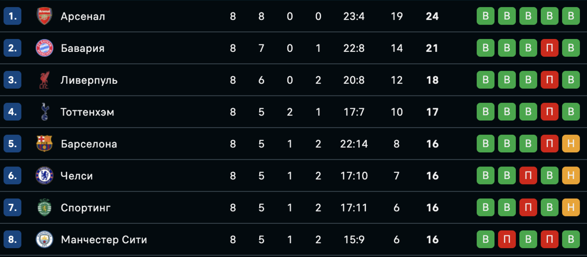 1. "Арсенал" (Англия) — 24 очка.