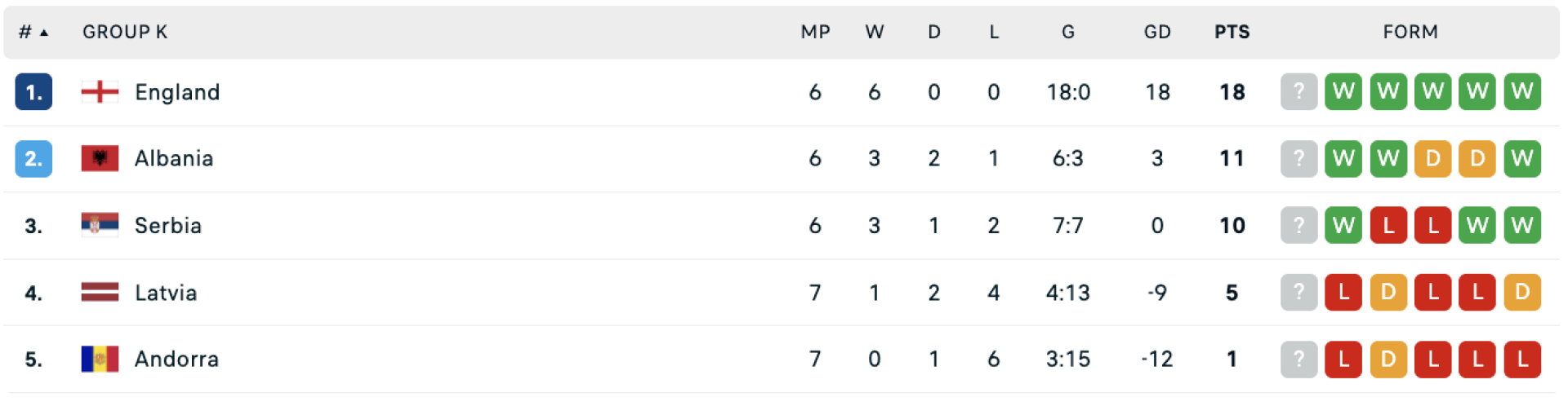 Таким образом, англичане победили со счетом 5:0 и набрали максимальное количество очков (18 из 18). Этот результат позволил им стать первой командой из Европы, которая досрочно квалифицировалась на чемпионат мира.