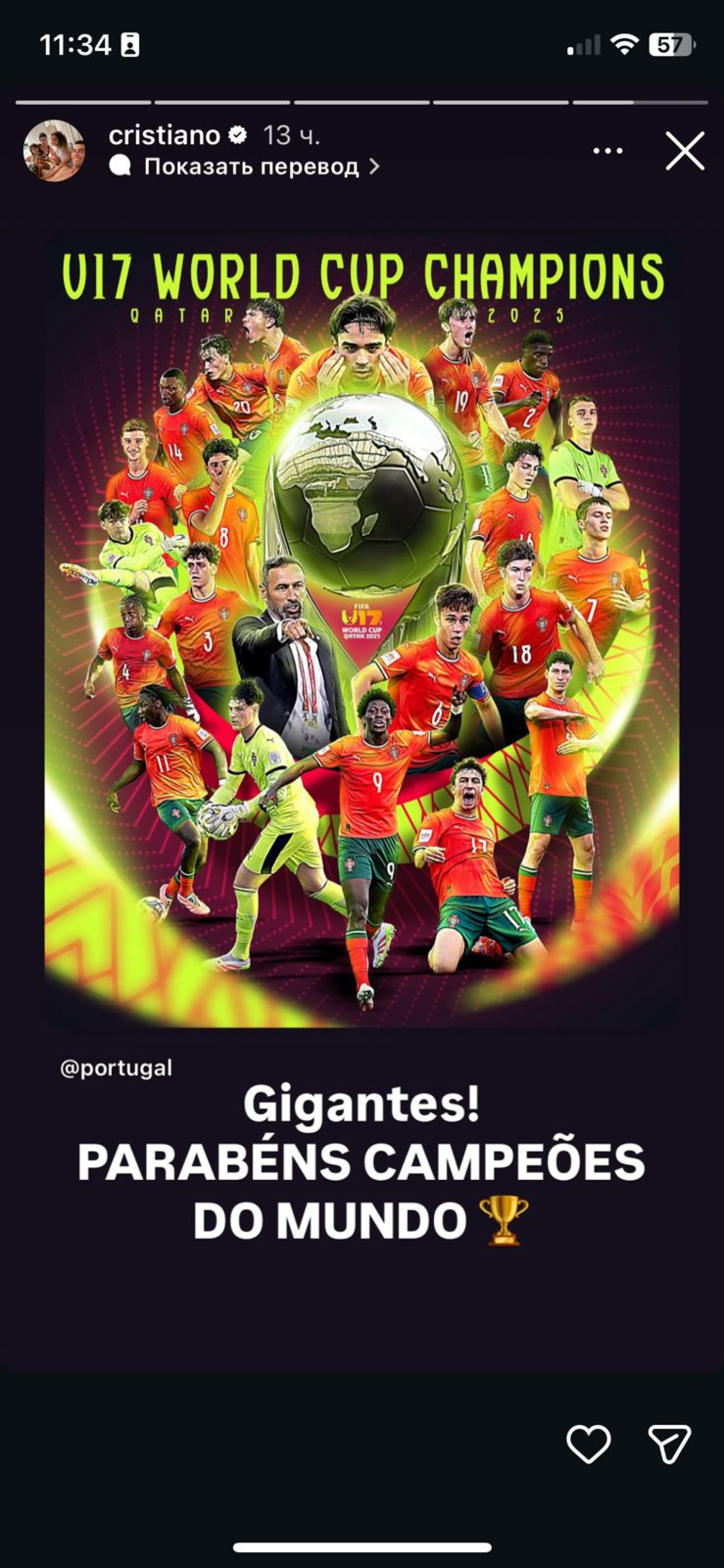 Знаменитый португальский футболист Криштиану Роналду поздравил юношескую сборную страны с исторической победой на чемпионате мира, передаёт Tengri Sport со ссылкой на соцсети игрока.