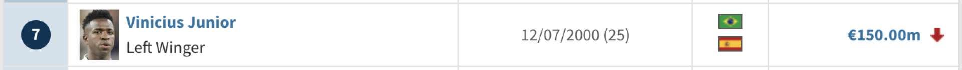 Одна из главных звёзд клуба - Винисиус Жуниор упал в стоимости на 20 миллионов евро. Теперь, по данным сайта, игрок оценивается в 150 миллионов.