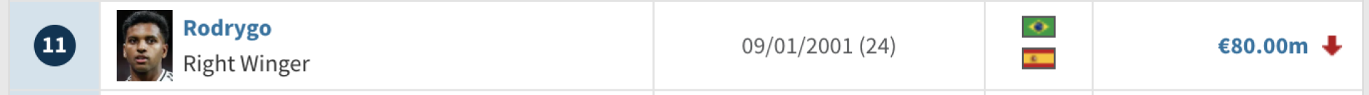 Ранее игрок оценивался в 90 миллионов евро, но после обновления вингер "потерял" 10 миллионов евро и теперь стоит 80 миллионов.