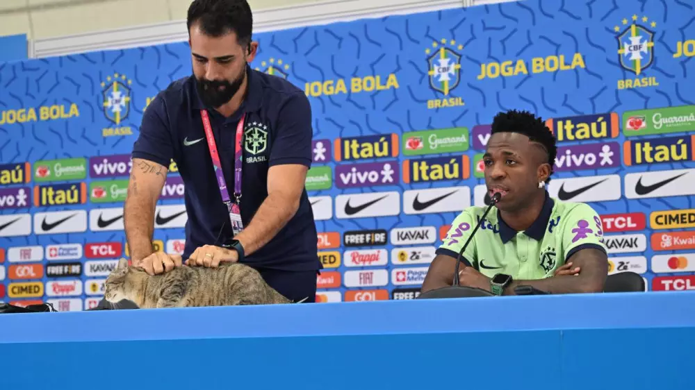 Напомним, во время пресс-конференции сборной Бразилии перед матчем четвертьфинала с командой Хорватии на стол запрыгнул кот. Пресс-атташе бразильской команды взял животное за шкирку и сбросил на пол. Несмотря на грубость, кот остался на пресс-конференции, расположившись у стола, за которым на вопросы журналистов отвечал Винисиус Жуниор.