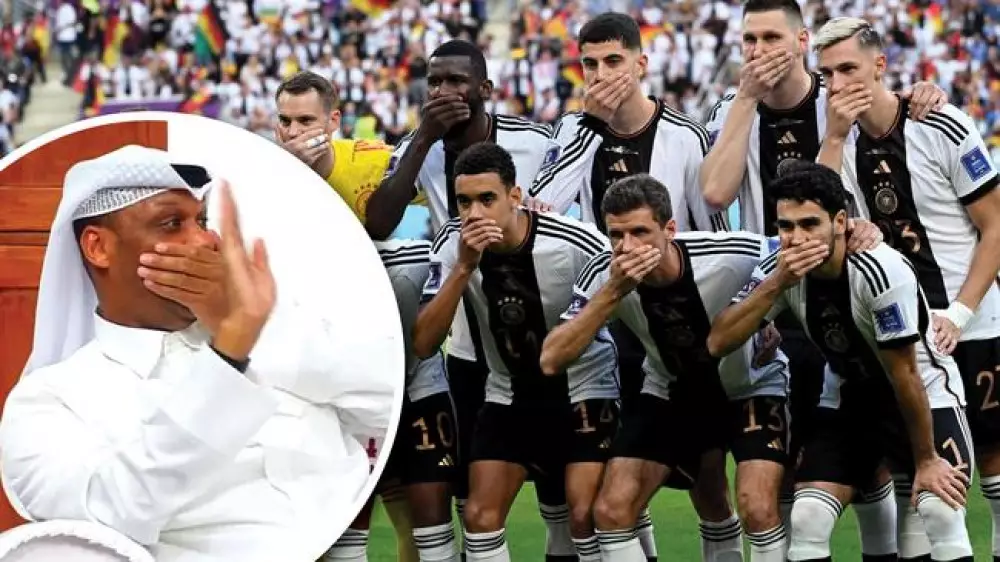Таким образом на телешоу спародировали акцию сборной Германии, которую команда устроила 23 ноября перед матчем первого тура группового этапа с Японией. Тогда на командной фотографии немецкие игроки закрыли руками рты, отреагировав на запрет ФИФА носить во время матчей мундиаля капитанские повязки в радужных цветах и с надписью "Одна любовь" в поддержку ЛГБТ-сообщества.