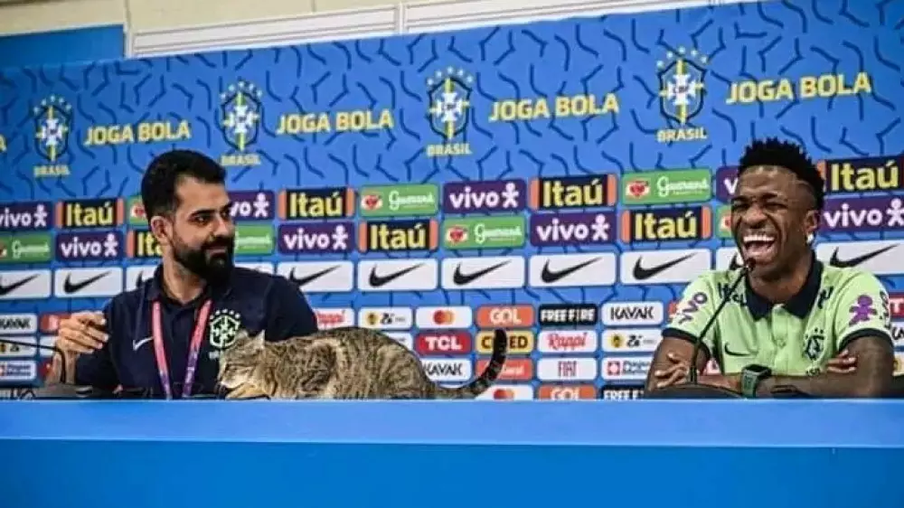Забавный эпизод произошел в момент сессии ответов на вопросы: форвард Винисиус Жуниор общался с прессой, а затем неожиданно рассмеялся. На стол запрыгнул крупный кот и прилег перед футболистом.