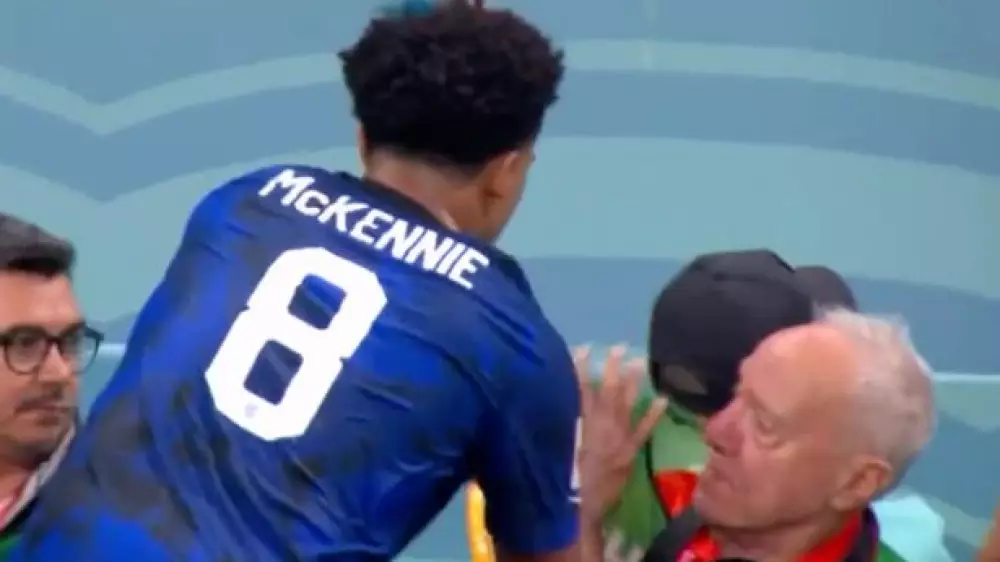 На 38-й минуте встречи американский полузащитник Уэстон Маккенни должен был ввести мяч из аута, но перед тем, как это сделать, он подошел к сидящему за рекламным щитом фотокорреспонденту и вытер руки о его манишку.